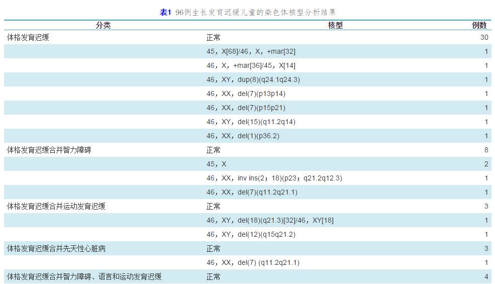 中华医学遗传学杂志, 2017,37(01): 147-149. DOI: 10.3760/cma.j.issn.1003-9406.2017.01.035选择2005年至2014年因生长发育迟缓来我中心进行遗传咨询和检查的96例儿童,年龄为3个月至11岁,均未行产前诊断。在知情同意原则下,抽取外周血2 mL行染色体核型分析,并收集相关的临床表型资料。根据世界卫生组织标准,体格发育迟缓的判断标准包括低体重(同年龄同性别体重<均数-2 SD)、生长迟缓(同年龄同性别身高<均数-2 SD)和消瘦(同身高同性别体重<均数-2 SD)。我国对智力障碍的鉴别标准包括智商在70分以下;日常需要的社会适应能力明显减弱,达不到社会所要求的标准;在18岁之前发病。