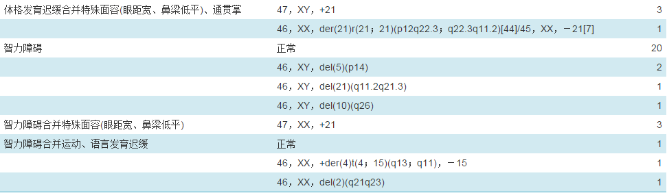 在常染色体异常中,21三体综合征为最常见的常染色体畸变,在新生儿中的发病率为1/600~1/800。21三体儿常表现为特殊面容(眼距宽、鼻梁低平)、通贯掌等,部分有体格发育迟缓,几乎均有严重的智力低下(在婴儿期智力低下表现可能不明显)。本研究共发现3例21三体患儿,年龄只有3~6个月,智力低下未明显表现。21三体环状染色体不是很稳定,在分裂过程中可能会丢失环而造成部分21单体,但在总体上还是表现为21三体综合征。猫叫综合征又称5p-综合征,是最常见的常染色体缺失综合征之一,在新生儿中的发病率为1/15 000~1/50 000[3]。猫叫综合征的临床表现为小头畸形、内眦赘皮、小颌畸形、发出类似猫叫的声音和严重的智力障碍[4]。Williams-Beuren综合征是由7q11.23微缺失所致,95%的患者缺失的片段为1.5~1.8 Mb,5%的患者有大片段的缺失[5]。Williams-Beuren综合征临床表现为典型的面部畸形、主动脉瓣狭窄、身材矮小、生长迟缓、早衰、高血钙症、轻到中度智力障碍等。当患儿同时存在体格发育迟缓、智力障碍和先天性心脏病时应高度怀疑患儿可能有7q11.23的缺失,7q11.23的缺失仅少数为大片段缺失,能通过染色体核型分析诊断出来;大多数为微缺失,染色体核型分析无法诊断出来,对于染色体核型分析结果正常的病例应通过荧光原位杂交或者基因芯片等技术进一步检测是否存在7q11.23的微缺失。10q26缺失会导致不同范围的表型异常,包括智力障碍、精神运动性阻滞、语言发育迟缓、颅面畸形、生长迟缓、心脏缺陷、张力减退、行为异常等[6]。1p36缺失综合征患者的症状包括中度到重度智力低下、宫内发育迟缓、生长迟缓、心脏畸形、听力障碍、视力障碍、异常颅面特征等。还有一些常染色体片段的重复或缺失,平衡易位携带者生育的遗传了不平衡衍生染色体的患儿也可能造成体格发育迟缓和(或)智力障碍。